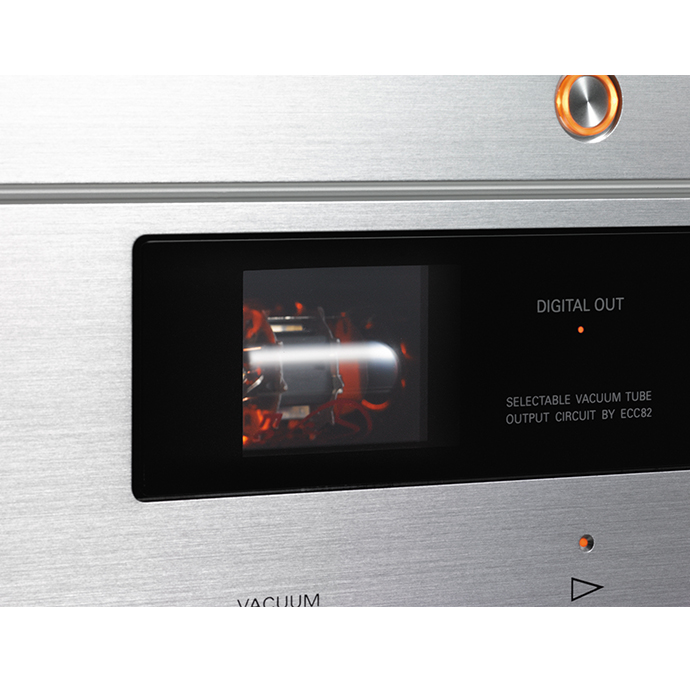 通過前面板撥桿開關(guān)來選擇不同音樂品味的功能。用戶可以選擇連接到DAC芯片的高純度晶體管輸出或電子管輸出,其中使用ECC82真空管的緩沖電路與高音質(zhì)薄膜電容和專用大型輸出變壓器相連。晶體管輸出具有鮮活靈動(dòng)、分析力突出的聲音,而電子管輸出則通過適當(dāng)增加調(diào)音元件為音樂帶來豐富的密度和韻味。這種音質(zhì)的切換甚至可以在播放CD時(shí)完成。當(dāng)選擇真空管輸出時(shí),ECC82被巧妙地照亮,這是一個(gè)豐富的設(shè)計(jì)元素,增加了環(huán)境的氛圍。