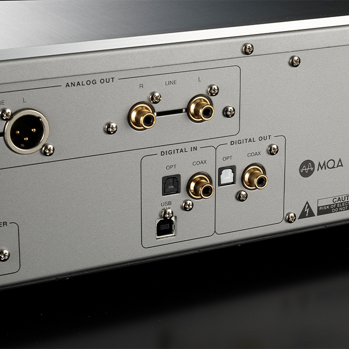模擬輸出包括兩個系統(tǒng):一個 32 毫米間距的鍍金 RCA 端子和一個新采用的 Neutrik 屏蔽 XLR 端子。豐富的數(shù)字系統(tǒng)包括一個用于 PCM/DSD 輸入的 USB 端子,以及一個同軸和一個光纖輸入/輸出端子,分別用于最高 192kHz/24bit 的 PCM 格式。