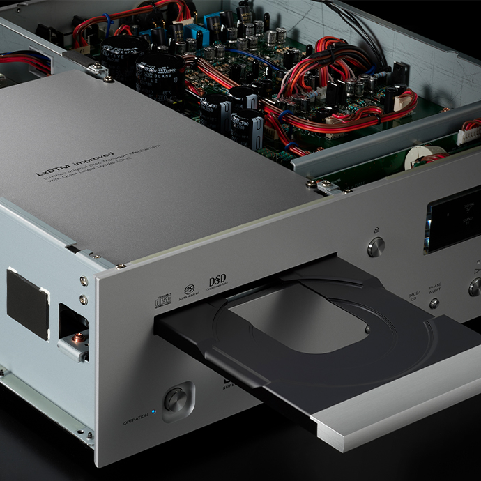 D-07X 采用了不對稱(非對稱)配置的左側(cè)機構(gòu)布局,為各種信號提供了最短、最理想的路徑和重量平衡,并確保了高質(zhì)量模擬電路的音量。用于 CD 和 SACD 播放的光盤驅(qū)動部分配備了 LxDTM-i*,它是在最初的高剛性 LxDTM 機構(gòu)的基礎(chǔ)上發(fā)展而來的,該機構(gòu)采用堅固的箱式結(jié)構(gòu),整個機構(gòu)由側(cè)面框架和頂板覆蓋,并通過將包含橫移裝置的驅(qū)動機構(gòu)直接安裝在堅固的側(cè)面底盤上,發(fā)展成為一種可剛性屏蔽外部振動的集成結(jié)構(gòu)。i*. 高精度和穩(wěn)定的信號讀取性能可與旗艦型號 D-10X 相媲美。光盤托盤由壓鑄鋁制成。消除了裝載機機構(gòu)中不必要的振動和共振,使裝載操作精確平穩(wěn)。