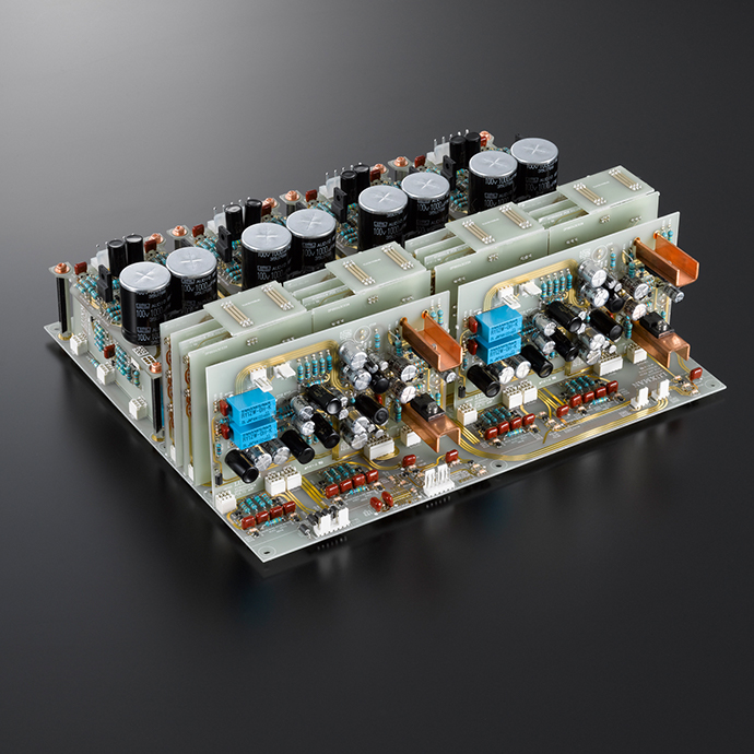 所有的音頻信號(hào)回路都使用了鍍金的100μm厚銅箔,并且采用了特殊構(gòu)成的去膠涂層基板,該基板信號(hào)線上沒有抗腐蝕層。通過排除抗腐劑覆蓋帶來的容量成分影響,降低圖案阻抗,將頻率劣化降至最低。并且通過盡可能保持寬度一致、拐角光滑的圓滑曲線來繪制走線圖案,確保即使是最微小的音樂信號(hào)也能順暢無阻地流動(dòng)。