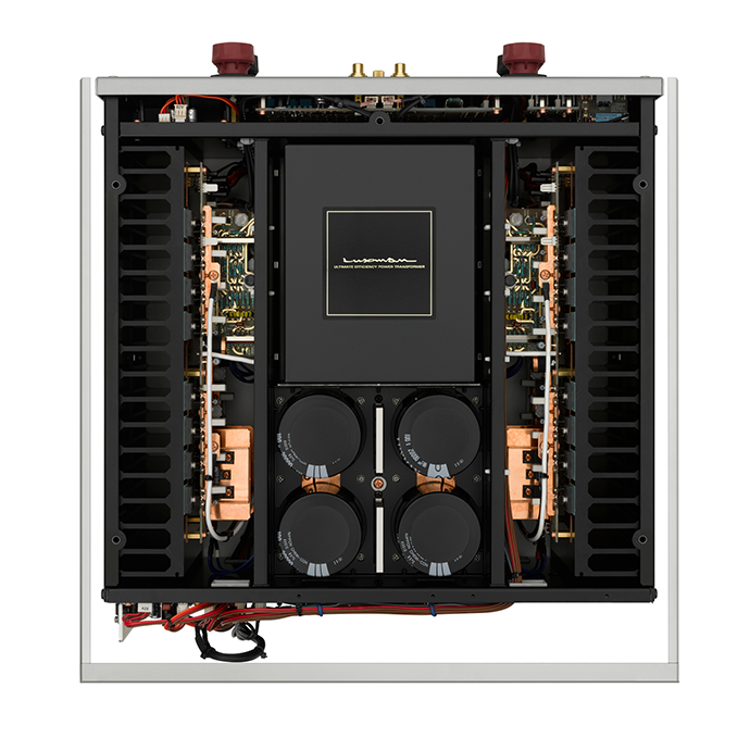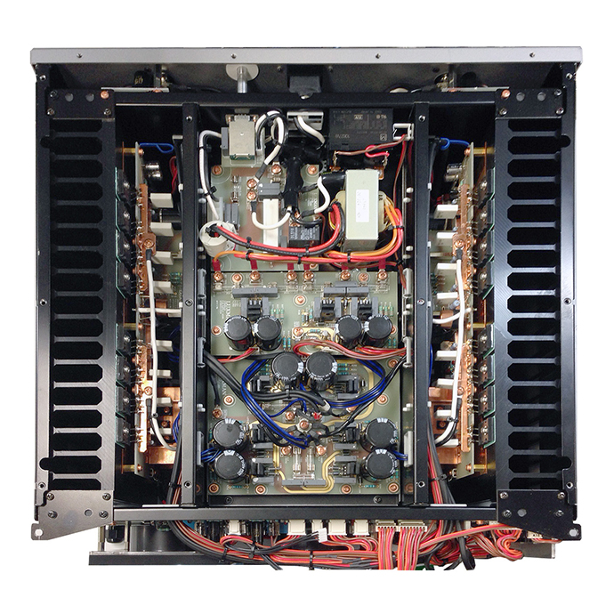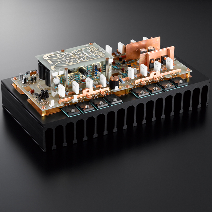 為了將20,000μF×4的大容量電容器提供的強大電源電流瞬間無損失地引入到放大電路,電源部分和輸出段之間的主要電流線路通過極厚的OFC母線進行硬連接直通。此外,為了無損失地傳遞由大規(guī)模輸出電路提供的高驅動力,配備了4觸點并聯連接的低電阻大容量揚聲器繼電器。實現了壓倒性的數值——阻尼系數710。