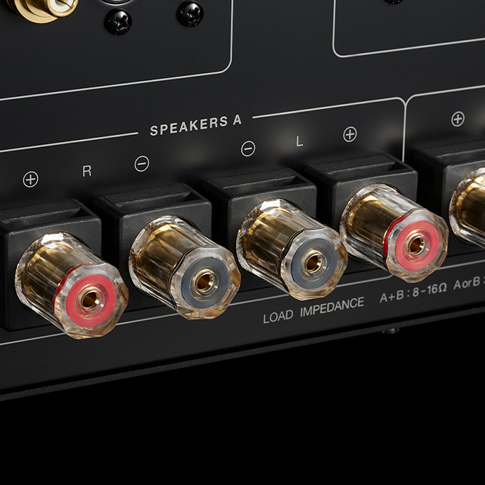 Lin-1 和Lin-2采用銅合金 RCA 端子,其導(dǎo)電性相當(dāng)于銅,硬度相當(dāng)于黃銅。用于擴(kuò)展系統(tǒng)的純后級(jí)模式輸入,還包括兩個(gè)前級(jí)輸出,兩個(gè)大型揚(yáng)聲器輸出端子,有獨(dú)立的開(kāi)/關(guān)切換,用于雙線連接。