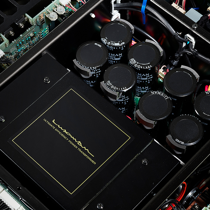 配備 Luxman 傳統(tǒng)的高慣性電源電路,具有定制的 600VA EI 型高穩(wěn)壓變壓器和新開(kāi)發(fā)的大容量電容器(10,000μF x 8)。電源電路配備了新型高慣性電源電路。