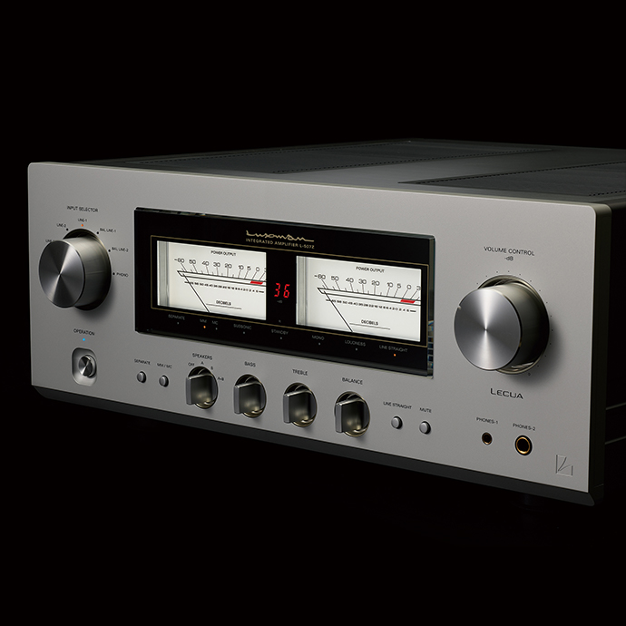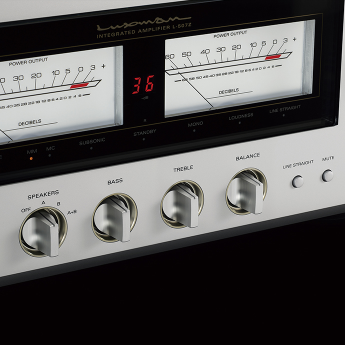 L-507Z 配有一個大型、反應(yīng)靈敏的儀表裝置,配備白色 LED 照明燈,具有極佳的可視性,還配有一個針形儀表,這是 Luxman 晶體管合并放大器的標志性設(shè)計。顯示指針跟隨音樂的動態(tài)同步工作。在左右音量表中央,有一個新的 7 段 LED 顯示器,用于顯示當前音量水平,即使在聆聽位置也能查看當前的音量位置。儀表照明和 7 段 LED 燈均可通過遙控操作進行開關(guān)。